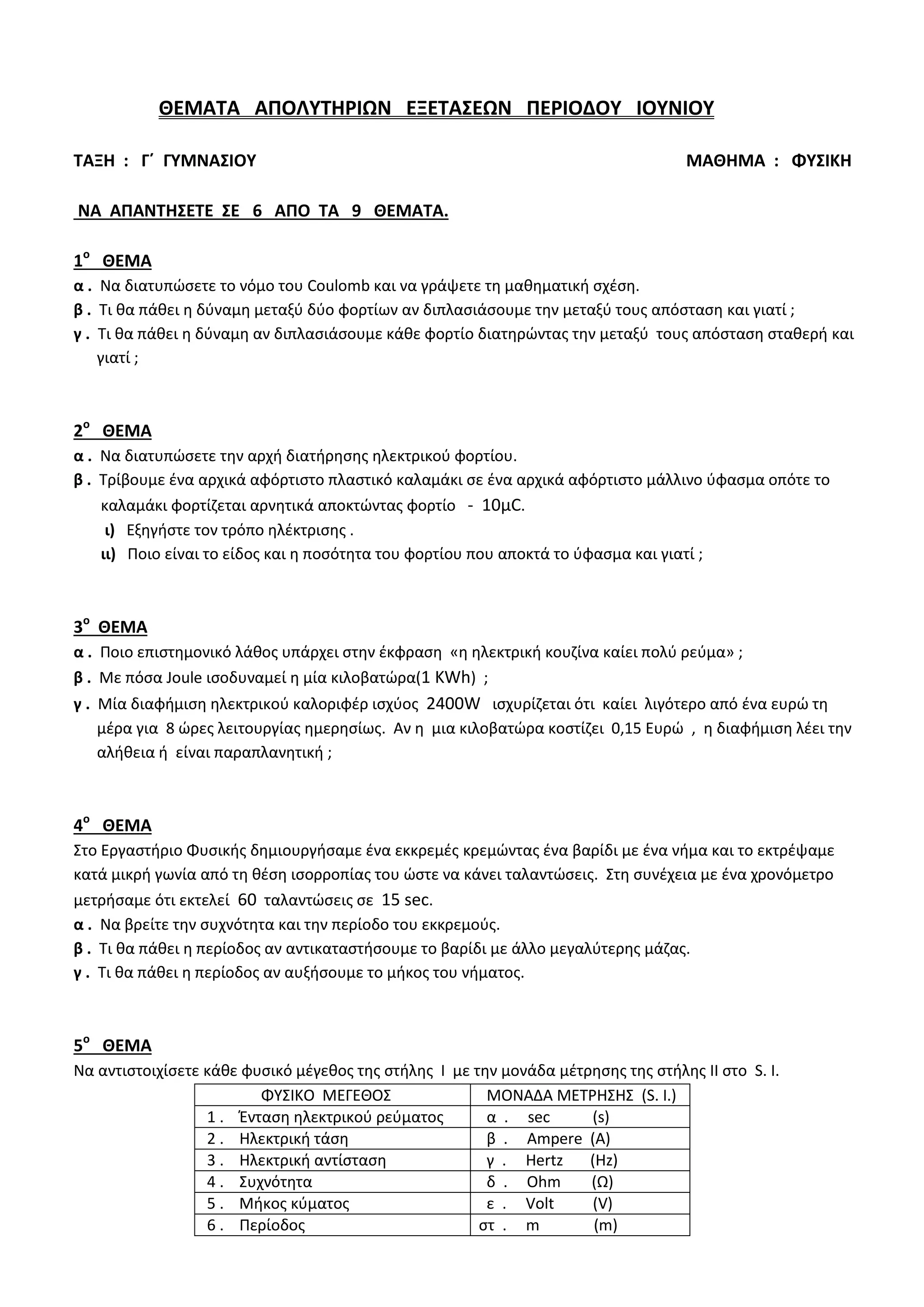 ΤΑΞΗ : Γ΄ ΓΥΜΝΑΣΙΟΥ ΜΑΘΗΜΑ : ΦΥΣΙΚΗ