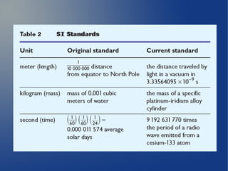 The document discusses measurement systems used in physics, emphasizing the SI system and the distinction between precision and accuracy. It explains how to convert units, calculate significant figures, and the importance of rounding in measurements. Examples and practice problems are provided to illustrate these concepts.