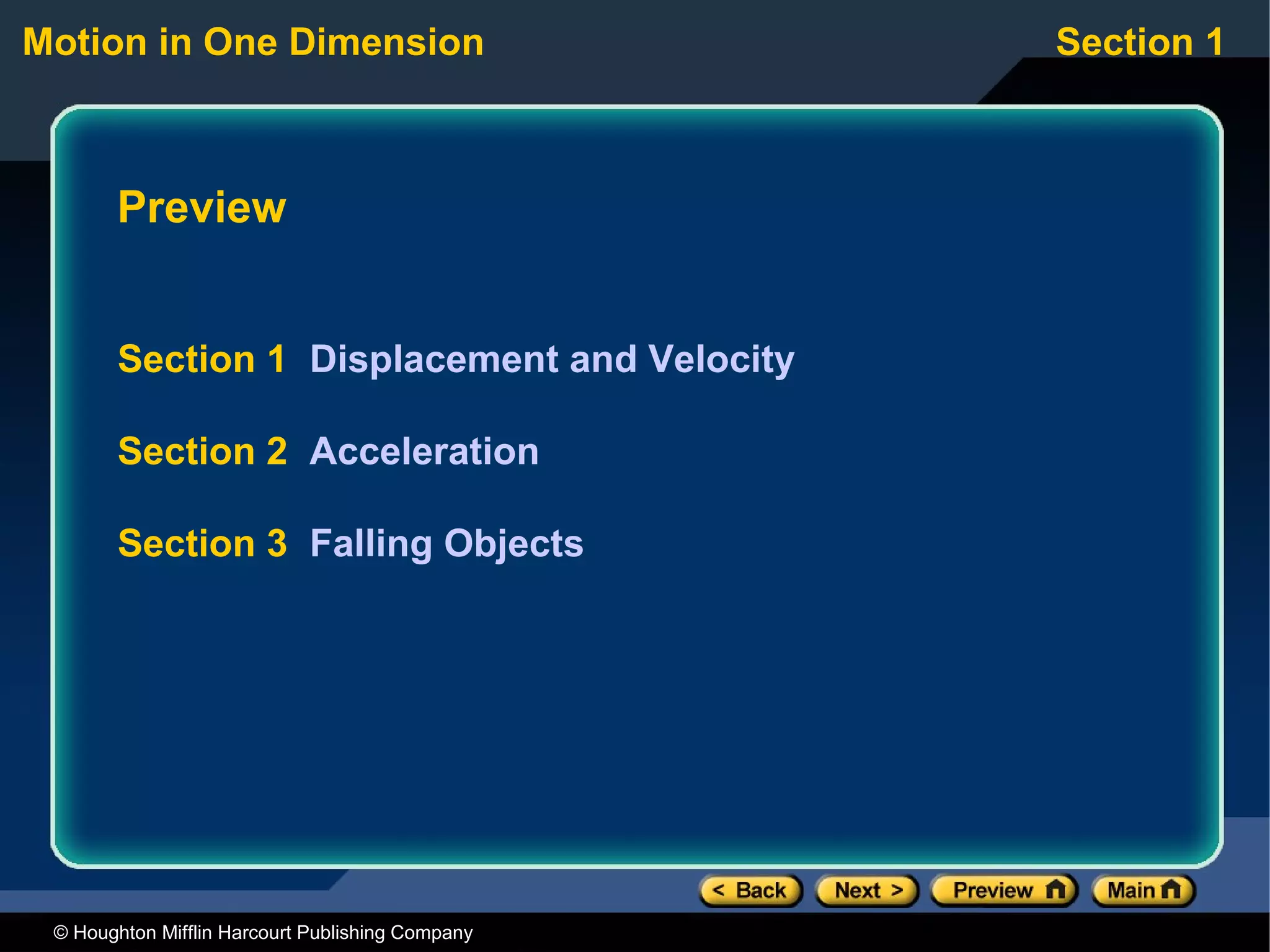 This document is an introductory section on motion in one dimension. It defines key terms like displacement, velocity, speed, frames of reference, and graphs motion. Displacement refers to the straight line distance between initial and final positions, while velocity includes both speed and direction. Motion depends on the frame of reference used. Graphs can show changes in position, velocity, and speed over time.