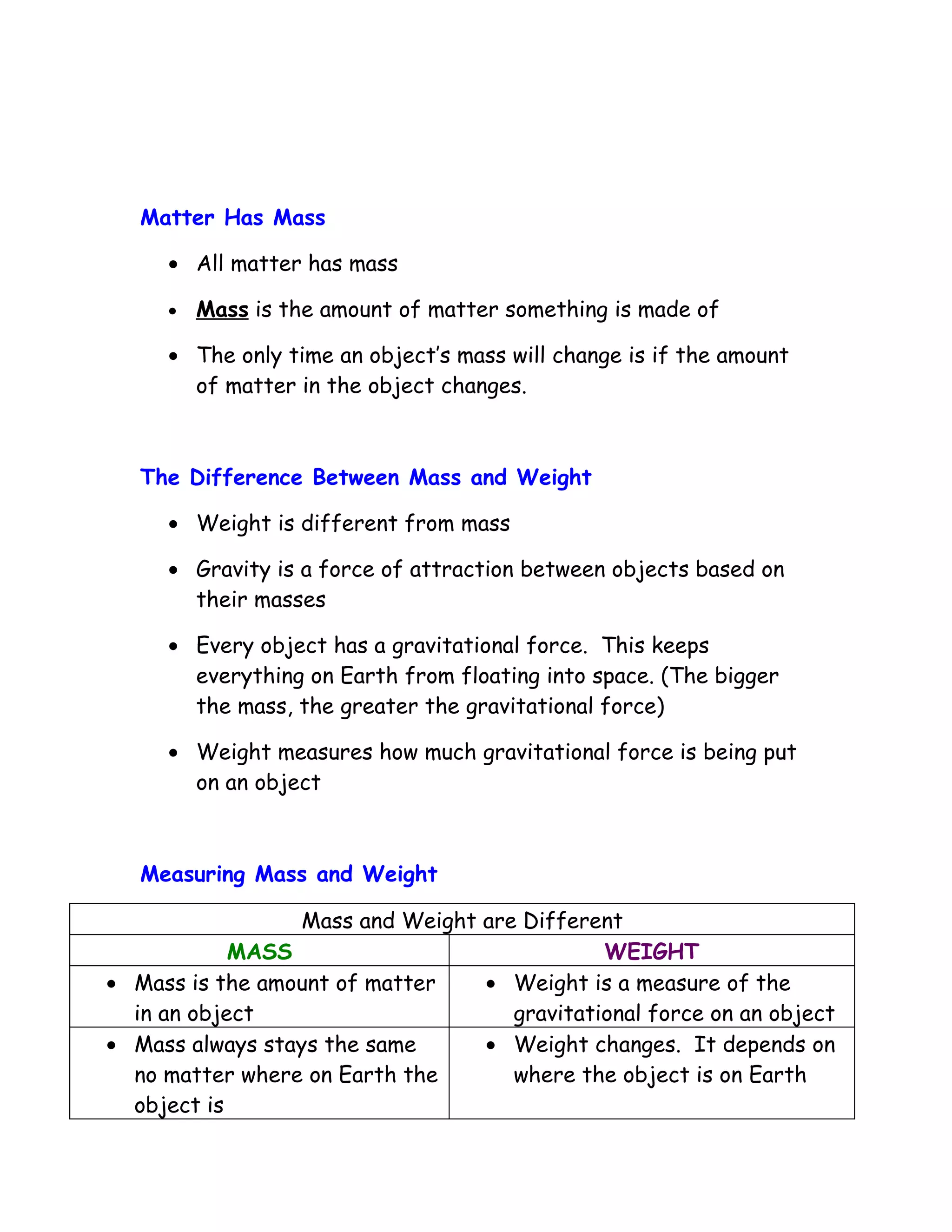 The document discusses the properties of matter. It defines matter as anything that has volume and mass. It describes volume as the amount of space an object takes up and mass as the amount of matter in an object. It distinguishes between mass, which is a measure of the amount of matter, and weight, which is the gravitational force on an object. It then discusses physical properties like state, density, and thermal conductivity, and chemical properties like flammability and reactivity. It contrasts physical changes, which change physical properties but not identity, with chemical changes, which form new substances.