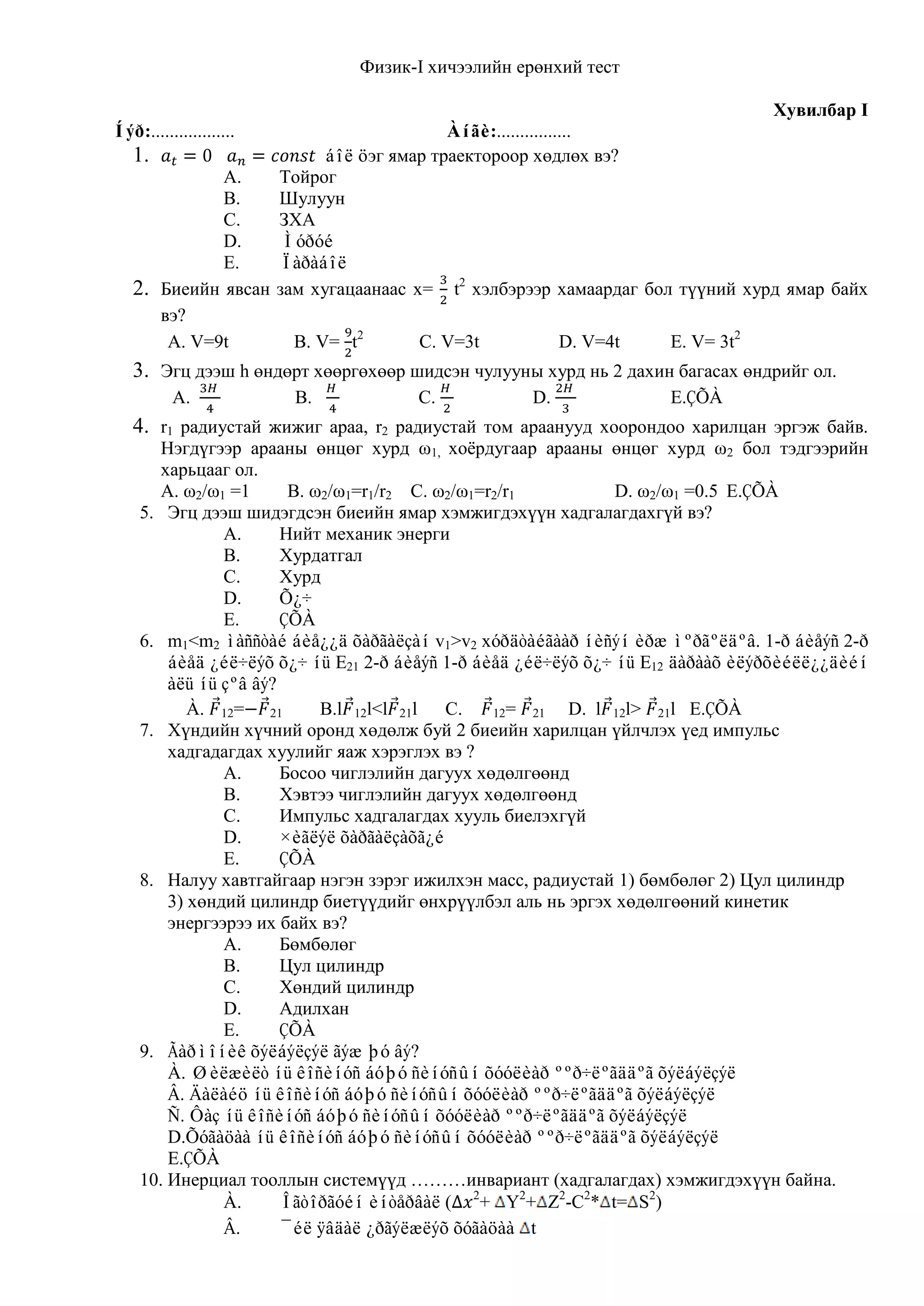 Физик-I хичээлийн ерөнхийтест