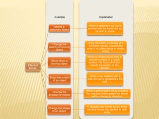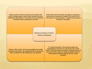 1) Newton's First Law states that objects at rest tend to stay at rest and objects in motion tend to stay in motion with the same speed and in the same direction unless acted upon by an unbalanced force.