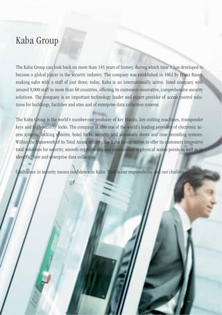 The Kaba Group provides security door systems and access control solutions including turnstiles, revolving doors, barriers, and locking systems. As an internationally active security company with over 145 years of history, Kaba offers innovative and comprehensive security solutions to customers in over 60 countries. Their product range includes electronic access control, time recording systems, and total access control strategies to provide security and convenience at building entrances.