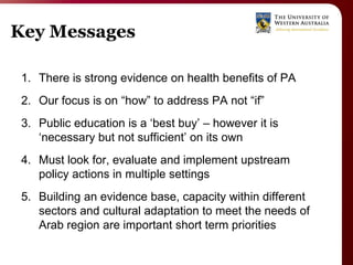 This document discusses the health benefits of physical activity and strategies for promoting physical activity at a population level. The key points are: