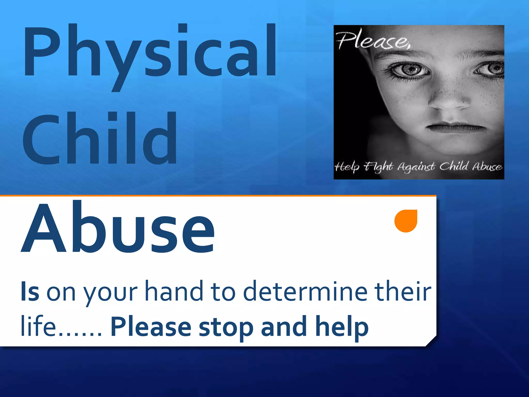 The document discusses physical child abuse, including signs and symptoms, behavioral signs, effects, and causes. Physical abuse can cause bruises, fractures, burns, and death. Abused children may be aggressive, fearful, or struggle in school. Effects include physical injuries, emotional issues like depression, and social problems forming relationships. Causes include lack of support, parenting skills, untreated mental illness, domestic violence, and substance abuse.