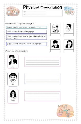 The document appears to be a student worksheet that includes blanks for a student to fill in their name, class, and date. It provides descriptions of four people - Mike, Bruce, Steve, and Roddy - and asks the student to write their names under the corresponding descriptions. It also includes pictures of three individuals - Lisa, Tom, and Sally - and asks the student to provide descriptions for each picture in the blanks.