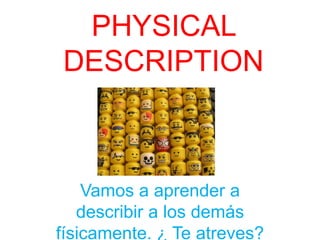 This document provides vocabulary for describing physical appearances in Spanish. It includes terms for different hair styles, colors, lengths and textures. It also lists adjectives for describing height, weight, and other physical attributes. Sample descriptions are given applying some of these terms, such as describing a woman who is short with wavy brown hair and is wearing a red skirt and white shirt. Another example describes a tall, handsome man with short straight brown hair wearing specific clothing items.