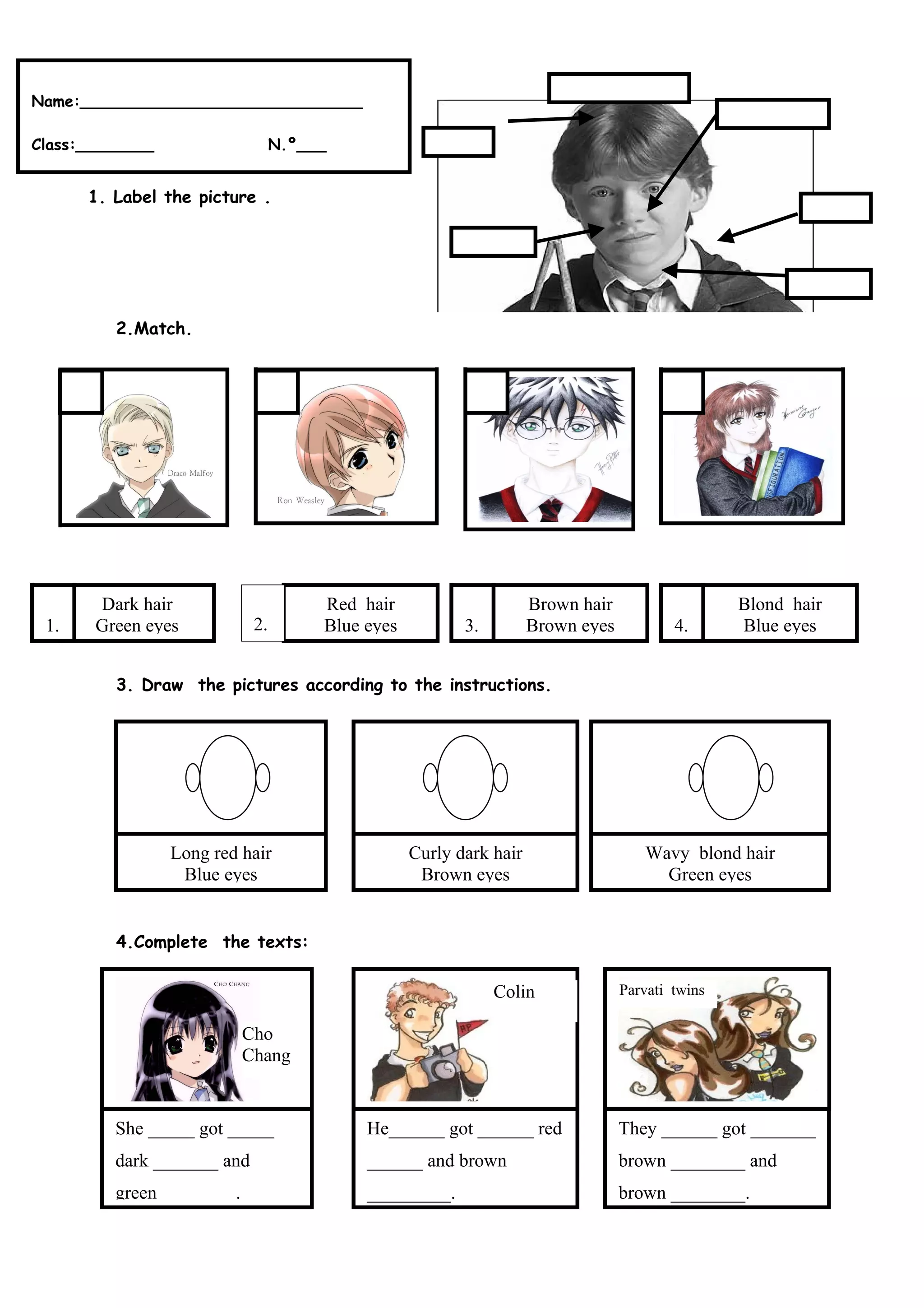 The document contains a classroom worksheet with various activities: 1) Label a picture, 2) Match characteristics to names, 3) Draw pictures based on descriptions, 4) Complete sentences with missing words, 5) Match descriptions to pictures, 6) Describe two pictures, and 7) Describe yourself. The worksheet focuses on vocabulary related to physical appearance.