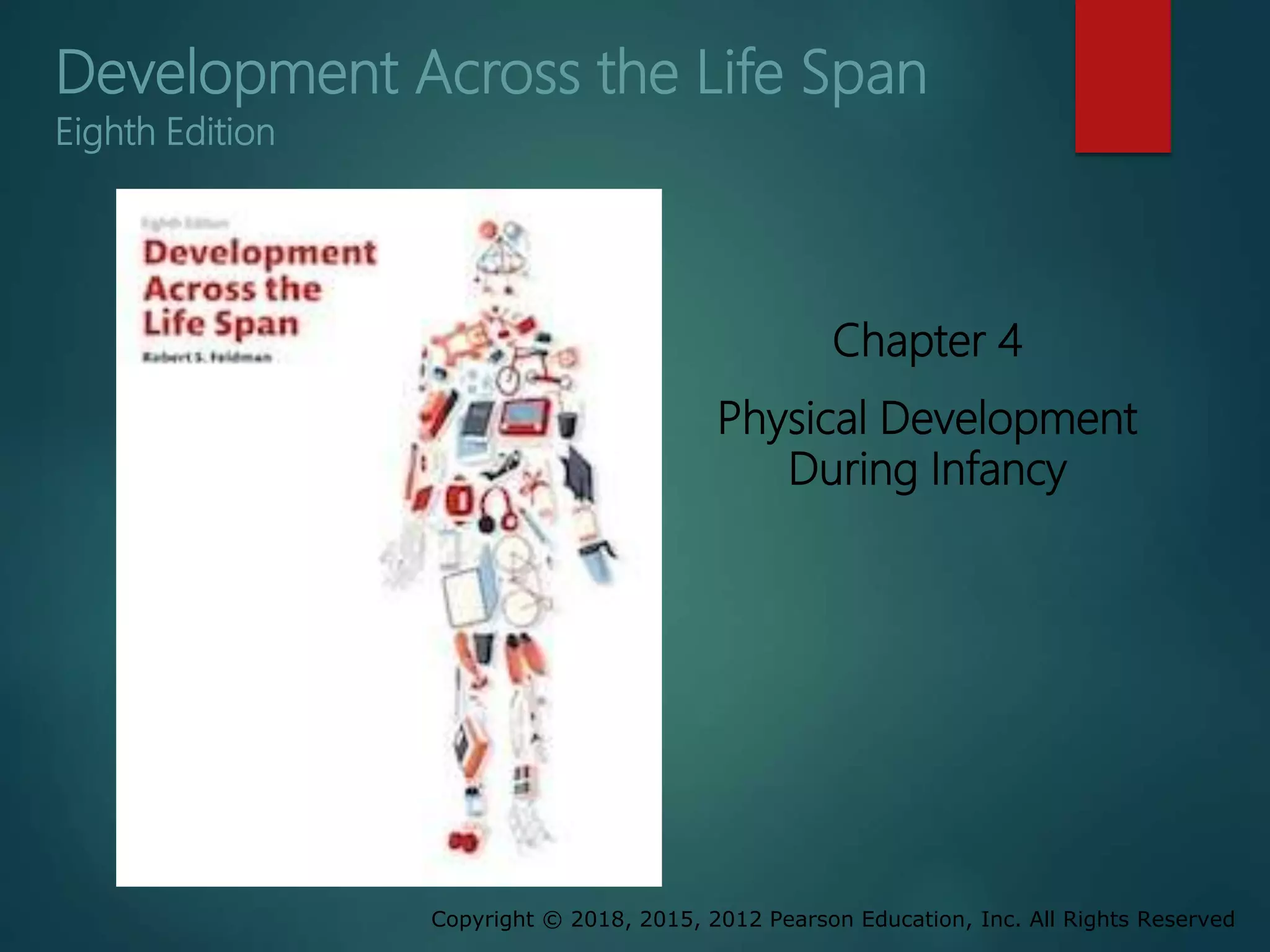 This document discusses physical development during infancy. It covers growth in height and weight from birth to age 1, with birthweight typically tripling. Four principles of physical growth are described: cephalocaudal, proximodistal, hierarchical integration, and independence of systems. Motor development milestones from rolling over to walking and jumping are provided, along with a chart showing fine motor skill development from ages 3 to 33 months. The development of the senses like vision, hearing, smell, taste and touch are also summarized.