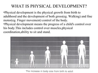 This document discusses physical development in children from birth through adolescence. It outlines the stages of development, including infancy, childhood, and adolescence. Key milestones are provided for physical abilities from 1 month to 2.5 years old, such as sitting, crawling, and walking. Factors that influence physical development are also summarized, including heredity, environment, diet, daily routine, sleep, and receiving love.