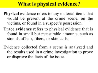 Physical evidence found at crime scenes can provide crucial clues for investigators. Trace evidence like hair, fibers, paint chips and glass fragments can be analyzed and sometimes matched to a specific person or object. The Locard's Exchange Principle states that every contact leaves a trace, so criminals may leave evidence behind or take evidence with them. A variety of evidence types including fingerprints, DNA, tool marks, bite marks, and more can be scientifically analyzed and compared to suspects.