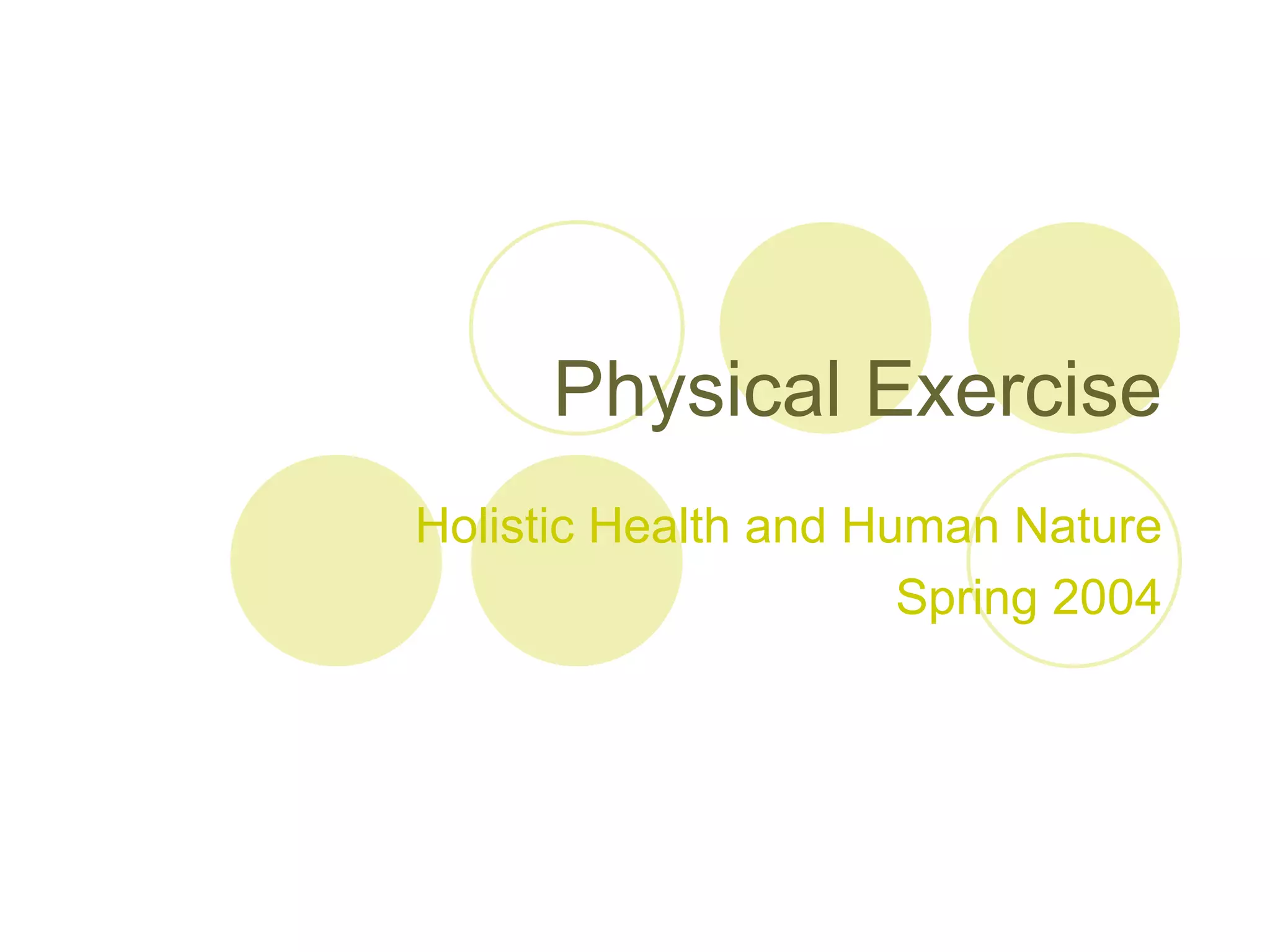 The document discusses the benefits of physical exercise based on a study of five individuals who began regular exercise routines. It finds that overall, participants experienced higher energy levels, improved moods, better sleep, and some weight loss or body changes. They also reported wanting to make healthier food choices. The study demonstrates that establishing a routine for aerobic exercise like walking, rollerblading, or yoga can provide both physical and mental well-being.