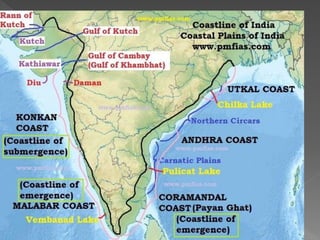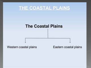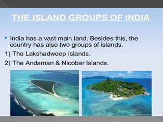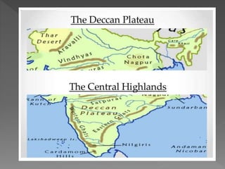 India has diverse physical features that include six main categories: the Northern Mountains, Northern Plains, Great Indian Desert, Peninsular Plateau, Coastal Plains, and Islands. The Northern Mountains range includes the Himalayas, which stretch from Kashmir to Arunachal Pradesh and contain three parallel ranges with the Greater Himalayas being the highest. The Northern Plains lie south of the Himalayan foothills and stretch across northern India. The Great Indian Desert is located west of the Northern Plains in Rajasthan and is a dry, sandy region with little rainfall.