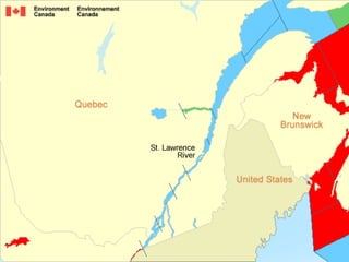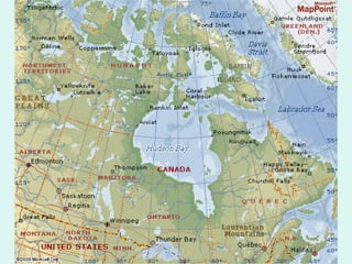 The document summarizes several of Canada's major physical features. It describes the Great Lakes region as the industrial heartland of North America and home to most of Canada's population. It also outlines the St. Lawrence River and Seaway system that connects the Great Lakes to the Atlantic Ocean and supports shipping and trade. Finally, it briefly touches on other key geographic elements like the Canadian Shield, Rocky Mountains, and surrounding oceans that define Canada's borders.
