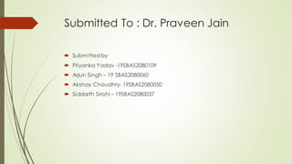 Soil problems in agriculture were examined. The document discusses four types of problematic soils: saline soils with high salt content, sodic soils with high sodium, waterlogged soils with poor drainage, and acidic soils with low pH. A team of four agriculture students submitted the report to their professor Dr. Praveen Jain on physical problems of soil.