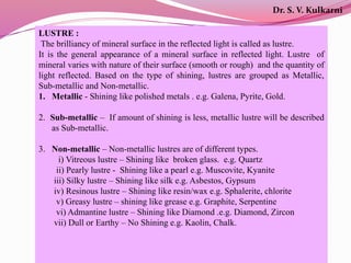 The document discusses various physical properties used to identify minerals, including luster, cleavage, fracture, hardness, specific gravity, and other diagnostic characteristics. It provides definitions and examples of different types of luster (metallic, sub-metallic, non-metallic), cleavage (perfect, imperfect, absent), fracture (even, uneven, hackly, conchoidal), Mohs scale of hardness (ranging from 1 to 10), approaches to measuring specific gravity, and other properties like color, streak, and reaction to acid that can aid identification. The document also includes examples of analyzing physical properties to identify mineral specimens.