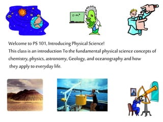 This document provides an overview and syllabus for a Physical Science 101 introductory course. It introduces the fundamental concepts in physics, chemistry, astronomy, geology, and oceanography that will be covered. Students will take online quizzes and exams on each chapter, complete a 5-page research paper and presentation, and work on a web project. The goal is for students to understand how these physical sciences apply to everyday life and be able to integrate concepts across disciplines to analyze real-world problems. Academic honesty, class policies, and resources for support are also outlined.