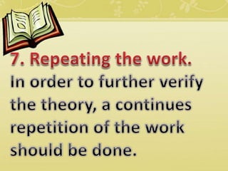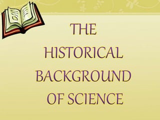 Science is defined as a body of systematically organized facts that serves as the basis for discovering general truths about the world. The main goals of science are to understand and explain the natural world, answer questions, and solve problems. While science seeks facts, it does not always reach absolute truth. Pure science aims to gain knowledge, while applied science puts scientific theories into practical use. Key periods in the history of science include ancient times, the Middle Ages, the Renaissance, the Scientific Revolution, and modern times. Major advances have included theories of motion, gravity, evolution, cells, genetics, and relativity.