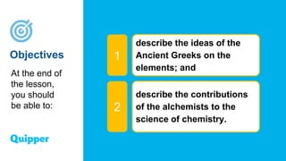 1. The Ancient Greeks proposed early theories of matter being made up of fundamental elements like earth, water, air and fire.