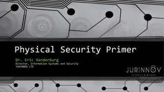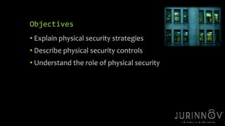 This document provides an overview of physical security strategies and controls. It discusses four key strategies: territoriality, natural surveillance, activity support, and access control. Various physical security controls are described, including locks, biometrics, lighting, alarms, closed-circuit television, fences, barriers, patrols, and interior safeguards. The goals of a physical security system are to provide the necessary level of protection through balancing security needs with operational and aesthetic concerns.