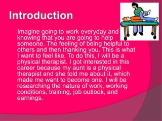 Physical Therapist is a career that involves diagnosing and treating people of all ages who have medical problems or injuries. Physical therapists examine patients, develop treatment plans to help them move, reduce pain and prevent disability. They work indoors in hospitals, clinics and private offices, often working 40 hour weeks. Becoming a physical therapist requires a master's degree with courses in biology, anatomy and chemistry. Employment is expected to grow faster than average and salaries average $72,790 annually.