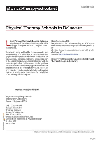 This document provides information on physical therapy schools in Delaware. It lists the University of Delaware's physical therapy program, which is located in Newark, Delaware. The program is accredited and offers a Doctorate in Physical Therapy degree requiring 105 credits. It has a class size of around 32 students and requires an undergraduate degree as well as 100 hours of clinical experience for admission. Contact information is provided for the physical therapy department.