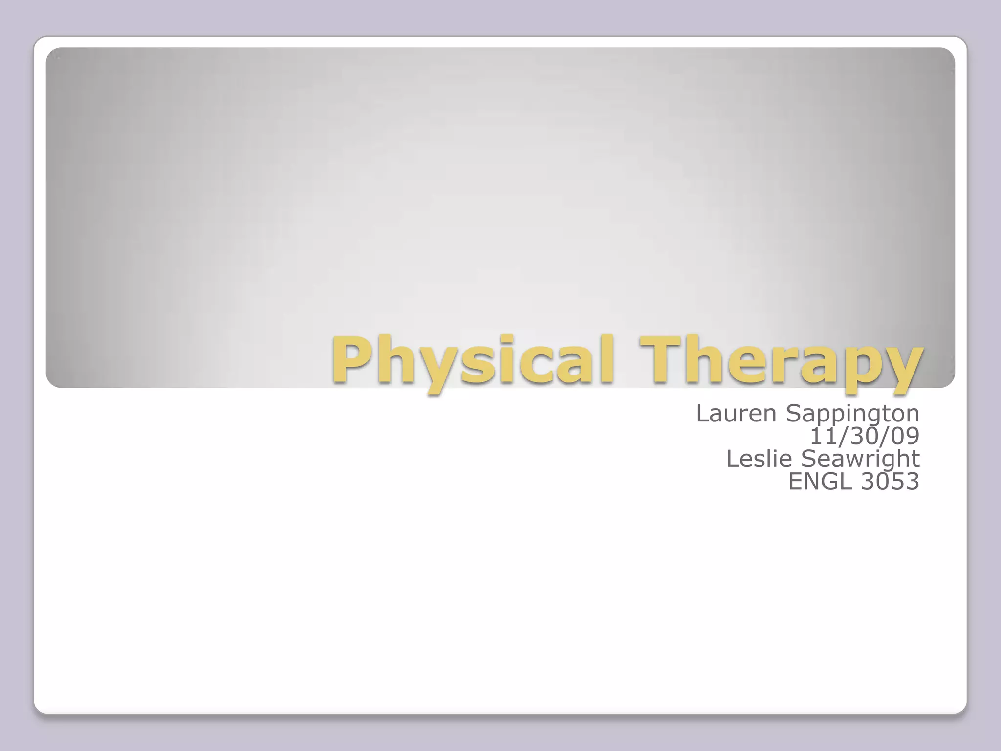 Physical therapy is a field that treats disabilities, impairments, and limitations through examination, evaluation, diagnosis, treatment plans and prognosis on an individual basis. Becoming a physical therapist requires an undergraduate degree in any field along with prerequisite courses, then admission to a competitive 3-year doctorate program. There are numerous specialty areas within physical therapy including orthopedics, pediatrics and cardiopulmonary. The job outlook is strong with an expected 27% increase in employment opportunities through 2016, especially in settings treating elderly patients.