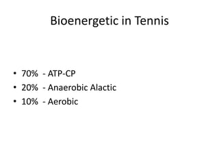 The document outlines the physiological and biomechanical aspects of tennis, emphasizing the importance of strength, endurance, speed, and flexibility in training. It discusses periodization of training cycles and the physiological profile of tennis match play, highlighting factors such as VO2max and lactate concentration. Additionally, it addresses nutritional needs and the risks of overuse injuries, along with strategies for rehabilitation and supplemental training.