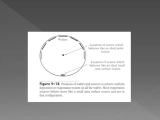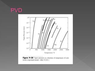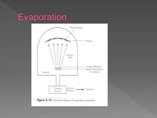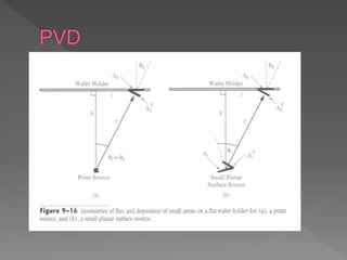 Physical vapor deposition (PVD) involves evaporating or sputtering material from a source to deposit thin films on a substrate in a vacuum chamber. In evaporation, a thermal source heats material which travels in straight lines to the substrate. Sputtering uses plasma to bombard a target, ejecting atoms which deposit with better step coverage. Both techniques can deposit a wide range of materials but sputtering provides better step coverage and evaporation risks contamination.