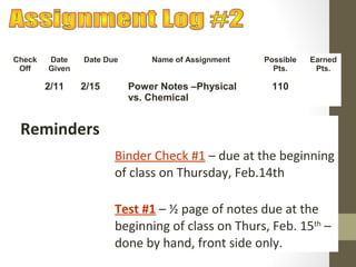 The document provides instructions and assignments for a science class, including completing power notes on physical versus chemical changes, reviewing gas laws illustrated with videos and graphs, and answering questions about the topics. Students are asked to log assignments, gather materials, finish tasks by certain dates, and turn in work individually or with group members. The document outlines the daily plan, assignments, and expectations for the science lesson.