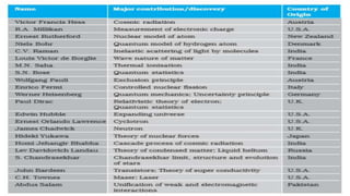 Physics is the study of natural phenomena in the physical world. It aims to understand and describe nature at its most fundamental level by making observations, performing experiments, and developing theories to explain experimental results. Some key ideas discussed are: