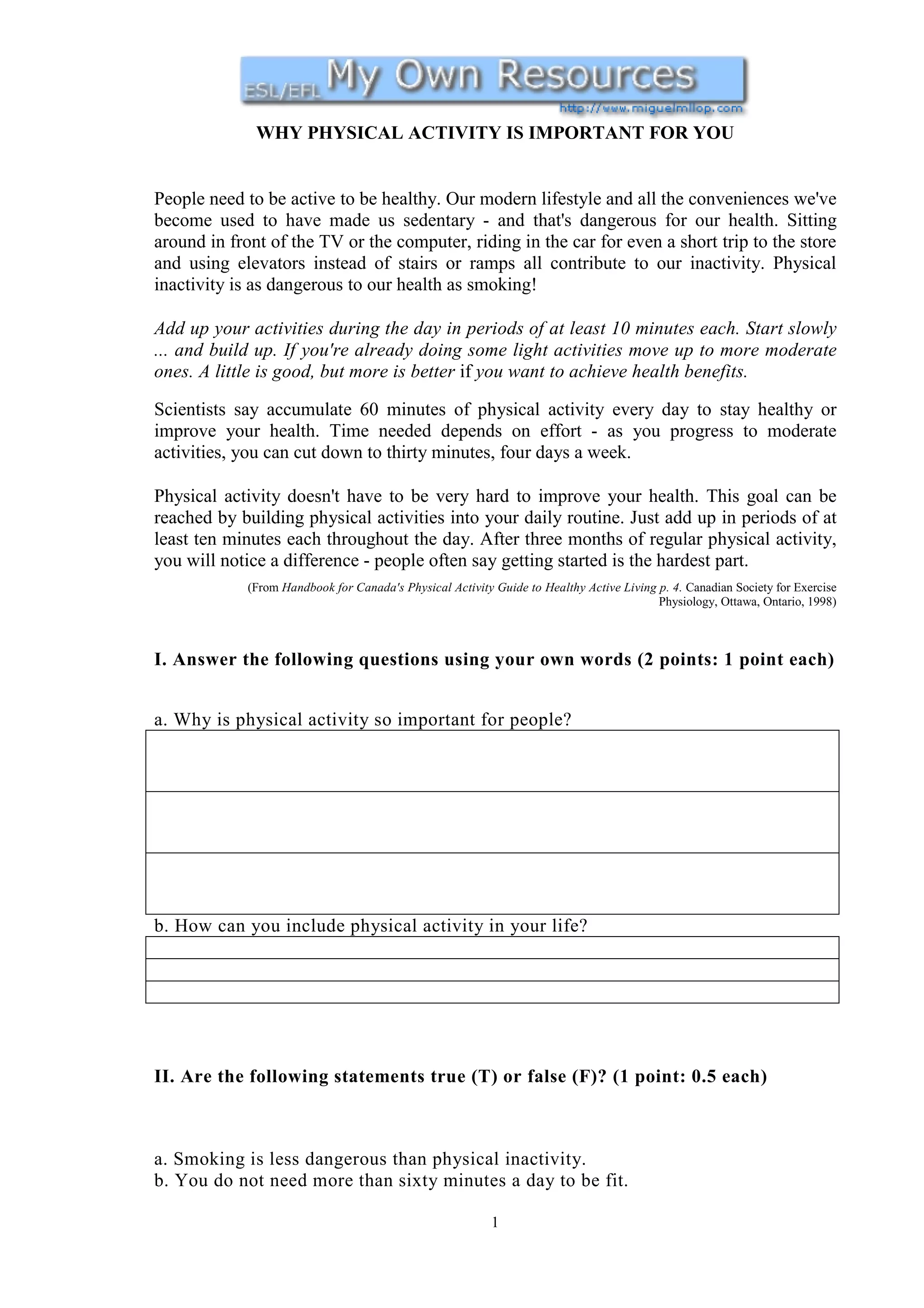 Physical activity is important for health in several ways: our modern lifestyle has made us sedentary through conveniences like cars and elevators, and physical inactivity is as dangerous as smoking. The document recommends accumulating 60 minutes of physical activity daily for health benefits, though 30 minutes four times a week can also be effective. Physical activity does not need to be strenuous; it can be built into daily life through activities done in 10-minute periods throughout the day. Starting regular physical activity can noticeably improve health over three months.