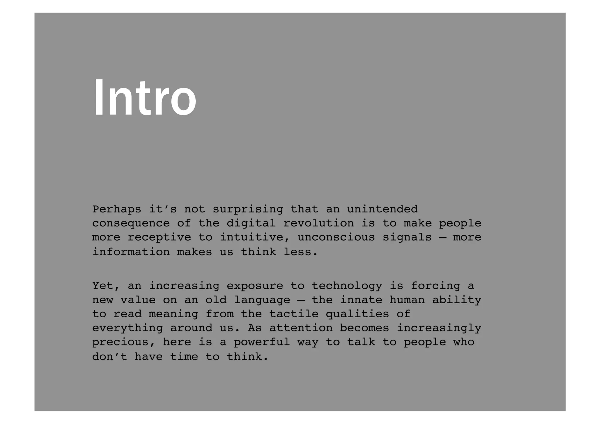 The document discusses the power of physicality as a communication tool, emphasizing the innate human ability to interpret meaning from tangible objects without conscious thought. It highlights how our emotional connections to physical items are influenced by factors such as intimacy, culture, and history. As an antidote to information overload in the digital age, it suggests leveraging physical communication to evoke deeper emotional responses.