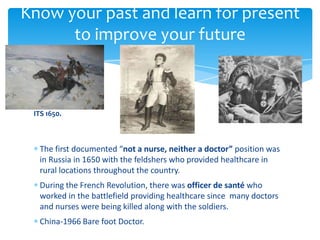 The document discusses the history and future of physician assistants (PAs) in India. It covers: