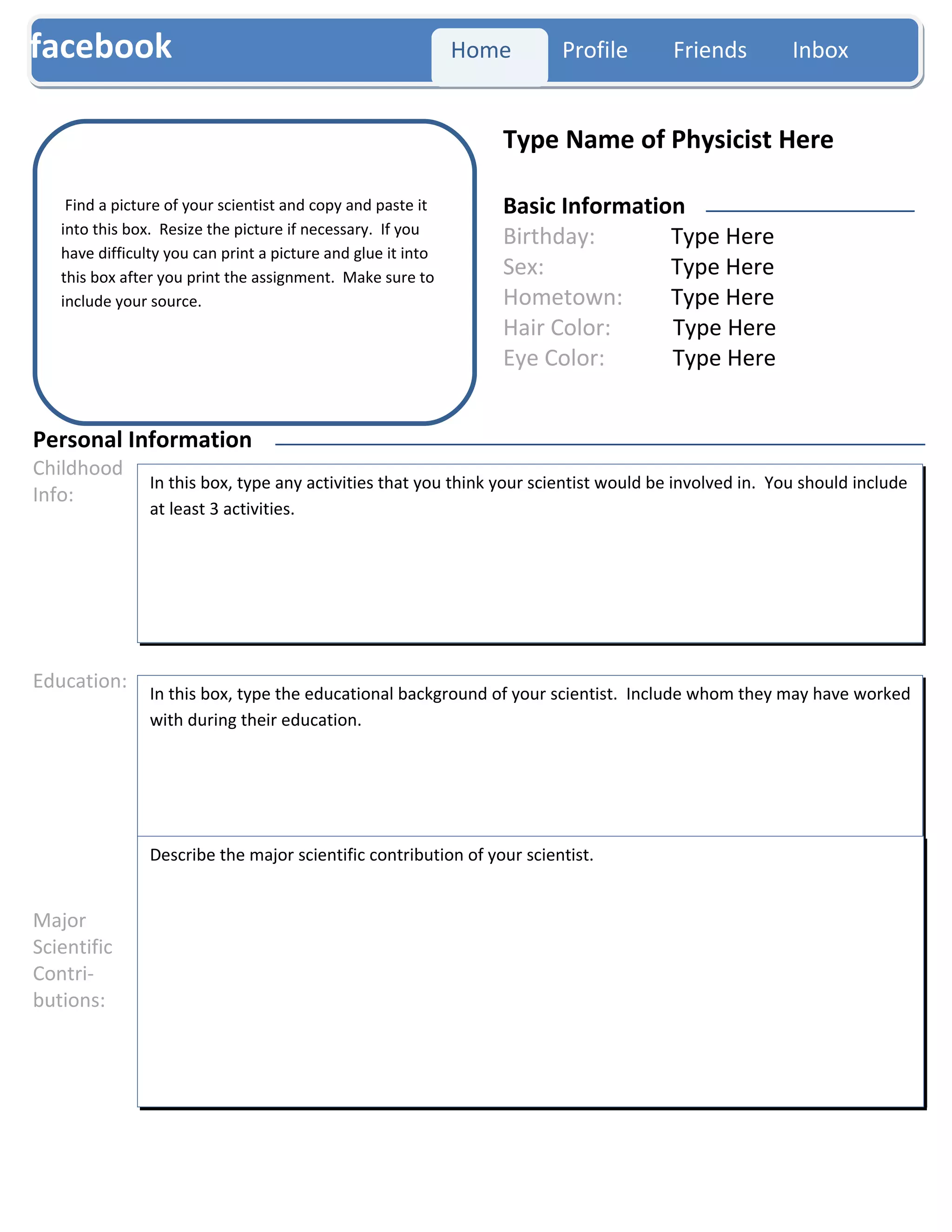 The document provides instructions for a student to create a Facebook profile for a physicist they have researched by filling in basic biographical information, describing important contributions and influences, and posting example wall posts discussing their work with other scientists. Key details include adding a photo, listing education and activities, and discussing major scientific achievements and historical context.