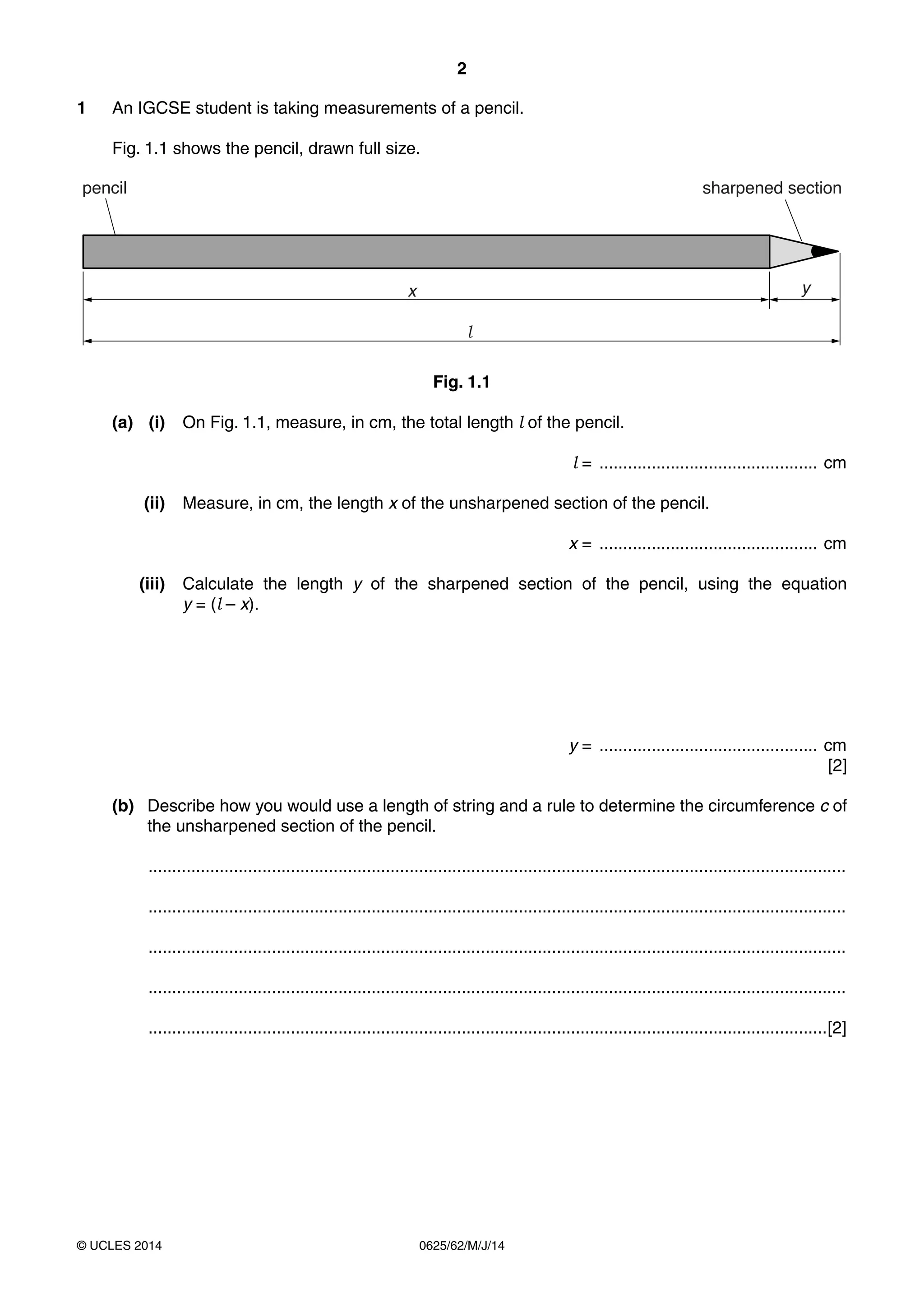 This document consists of 11 printed pages related to a Cambridge International General Certificate of Secondary Education physics exam. The exam contains questions on measuring a pencil, investigating the cooling of water, determining resistance in a circuit, and finding the focal length of a lens. Students are instructed to show their working, use appropriate units, and securely fasten their work at the end.