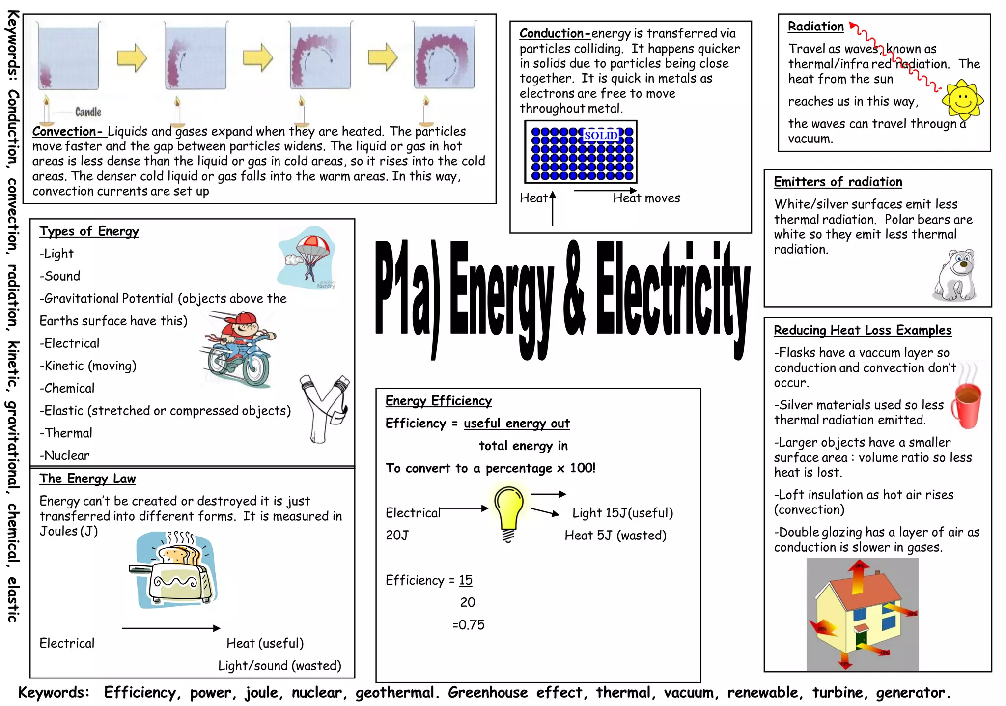 Energy can be transferred through conduction, convection, and radiation. Conduction involves particle collisions, convection involves the movement of heated liquids and gases, and radiation involves the transfer of energy through electromagnetic waves. There are many forms of energy including light, sound, gravitational potential, electrical, kinetic, chemical, elastic, thermal, and nuclear. Efficiency is a measure of useful energy transferred compared to total energy input. Fossil fuels like coal, oil, and gas are non-renewable but have short start up times, while renewable sources like wind, geothermal, hydroelectric, tidal, solar and nuclear do not produce greenhouse gases but have other disadvantages depending on the source.