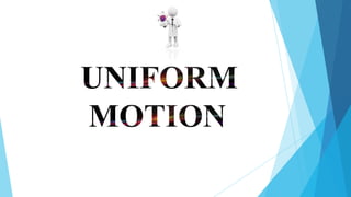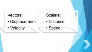 3. Important concepts in motion include speed, velocity, distance, displacement, scalars, and vectors. Kinematics formulas summarize relationships for one dimensional motion with constant acceleration.