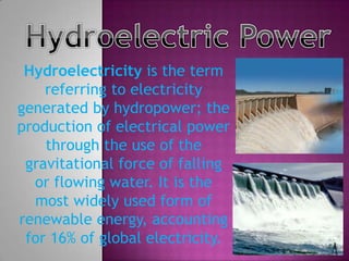 Hydroelectricity is electricity generated by hydropower through the gravitational force of falling or flowing water, making it the most widely used renewable energy source globally, accounting for 16% of electricity production. Water resource management involves planning, developing, and distributing water resources to balance competing demands.