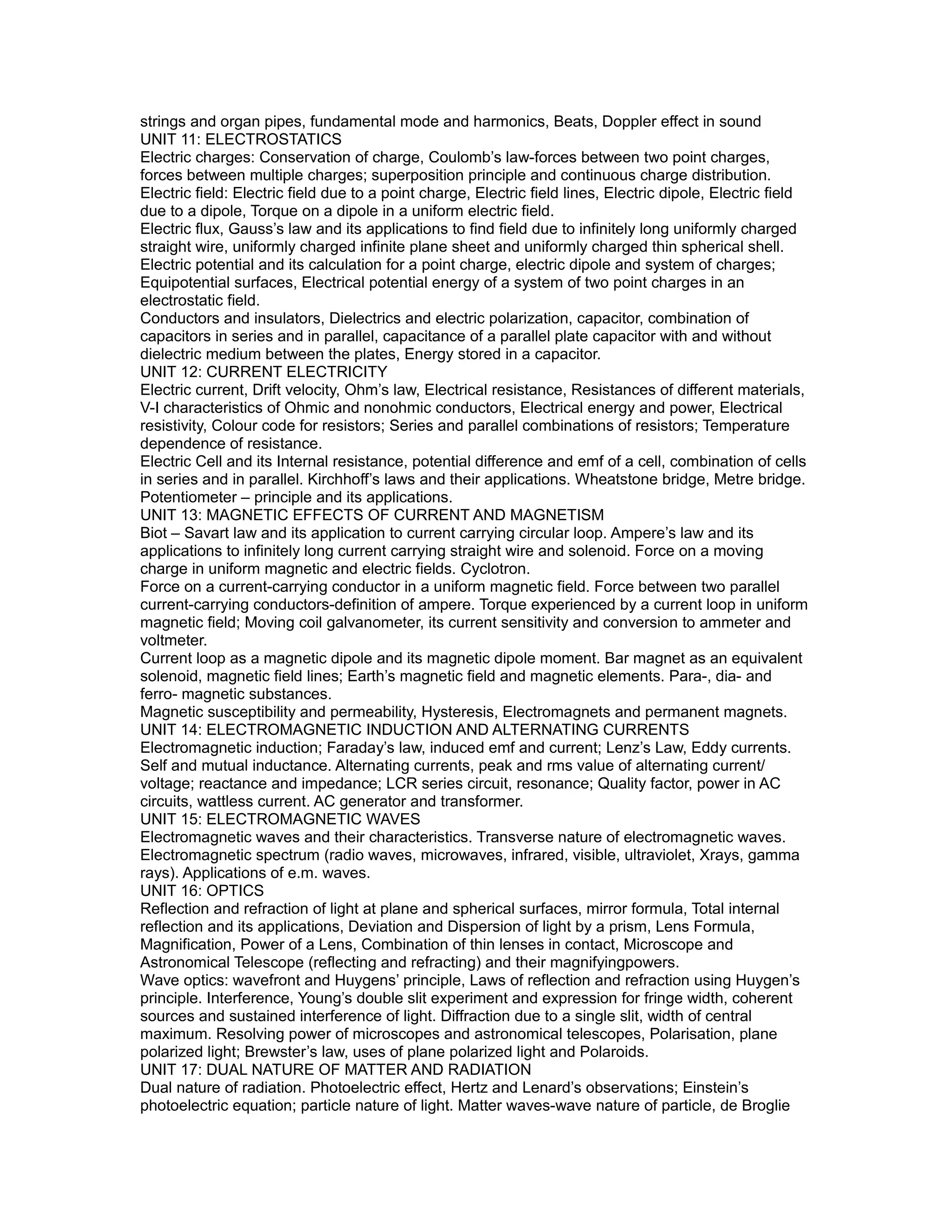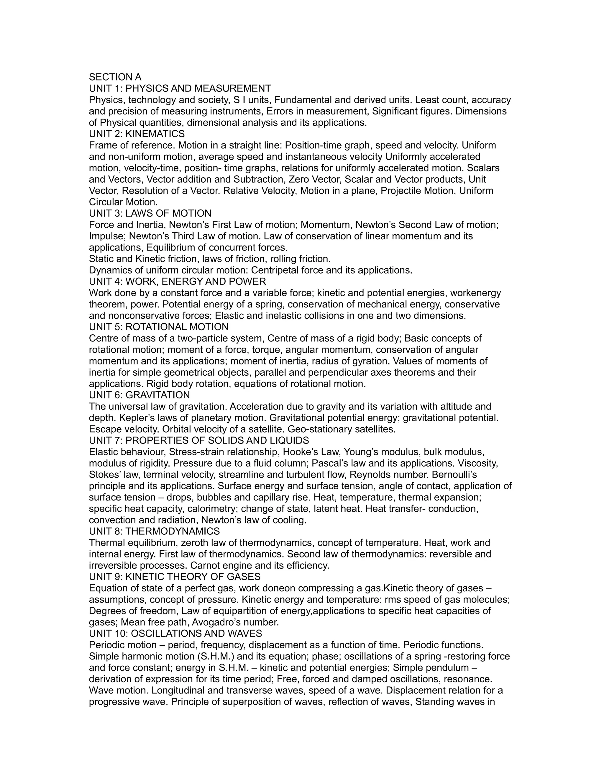 This document provides an overview of the syllabus for Physics. It includes 20 units that cover topics such as kinematics, laws of motion, work, energy and power, properties of matter, thermodynamics, oscillations, waves, electromagnetism, optics, modern physics, electronics and communication systems. The units introduce fundamental concepts, important formulas, and applications in each area of physics.