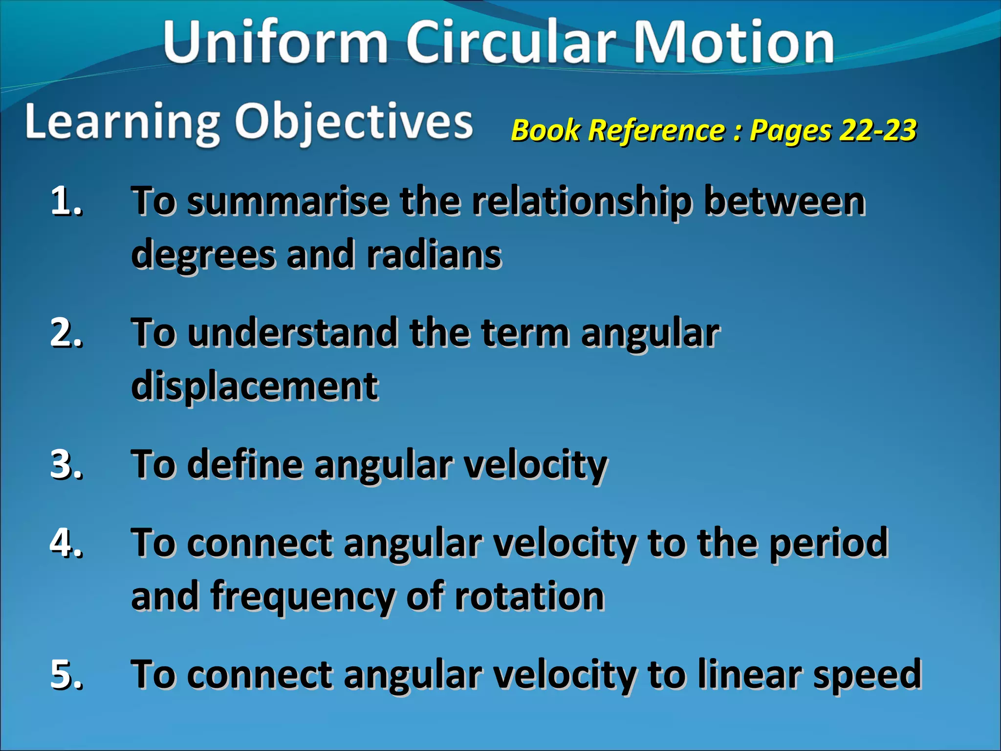This document defines key terms related to angular displacement, velocity, and motion. It explains that angles can be measured in degrees or radians, with 360° equal to 2π radians. Angular displacement is the angle an object rotates through, measured in radians. Angular velocity is the rate of change of the angular displacement with respect to time. Angular velocity and period are related to frequency, as angular velocity equals 2π divided by the period. Linear speed can also be calculated from angular velocity and radius of rotation. Examples are provided to illustrate these relationships and calculations.