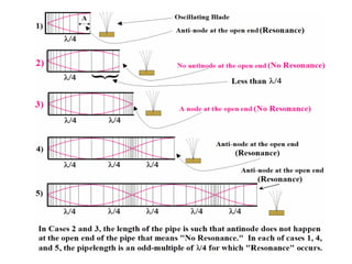 2) Resonance occurs when an object vibrates at its natural frequency, causing large oscillations. Standing waves can form in pipes and strings, with nodes and antinodes depending on boundary conditions and wavelength.