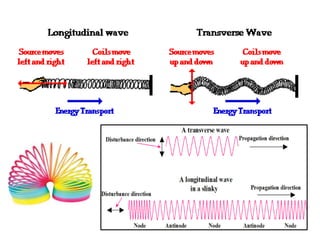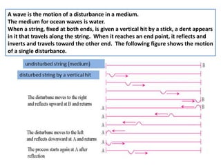 1) A wave is a disturbance that transfers energy through a medium without permanent transfer of matter. This document discusses mechanical and electromagnetic waves, their characteristics such as wavelength and frequency, and how waves behave in different media like strings and pipes.