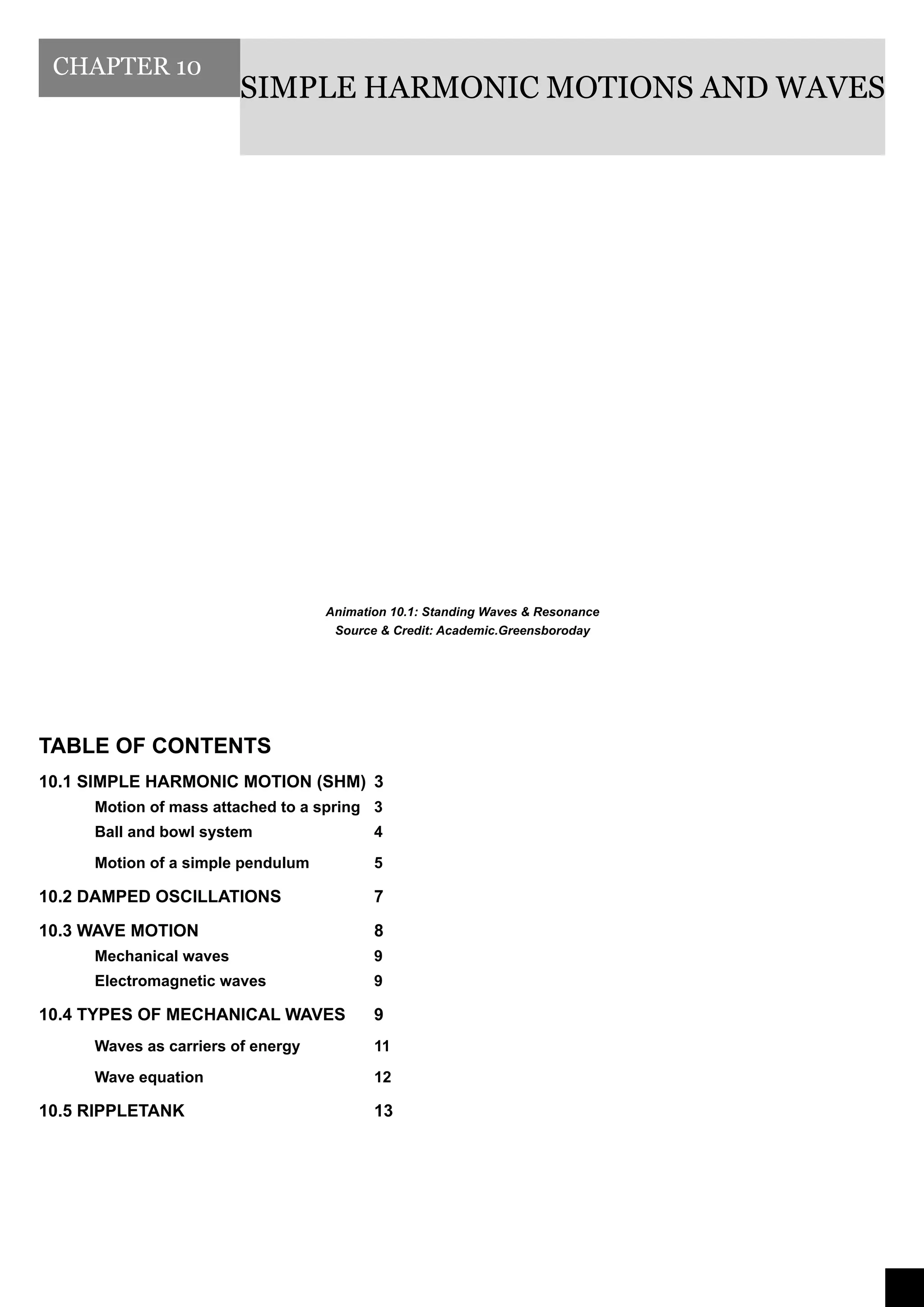 This document provides an overview of simple harmonic motion and waves. It begins by defining simple harmonic motion and providing examples of objects exhibiting SHM, such as a mass attached to a spring, a ball in a bowl, and a pendulum. It then discusses damped oscillations and how friction reduces amplitude over time. Next, it introduces the topic of wave motion, distinguishing between mechanical and electromagnetic waves. It defines key wave properties and concepts. The document concludes by describing experiments that can be performed to demonstrate water and rope waves.