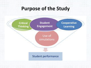 The study examines the impact of computer simulations on student performance in high school physics, highlighting their effectiveness in enhancing engagement, critical thinking, and cooperative learning. It suggests that while simulations improve understanding and motivation, they cannot replace teachers, and effective teaching strategies must be combined with technology. The research indicates significant positive relationships between simulated learning and student achievement, gathering data from physics teachers associated with the American Modeling Teachers Association between 2013 and 2014.