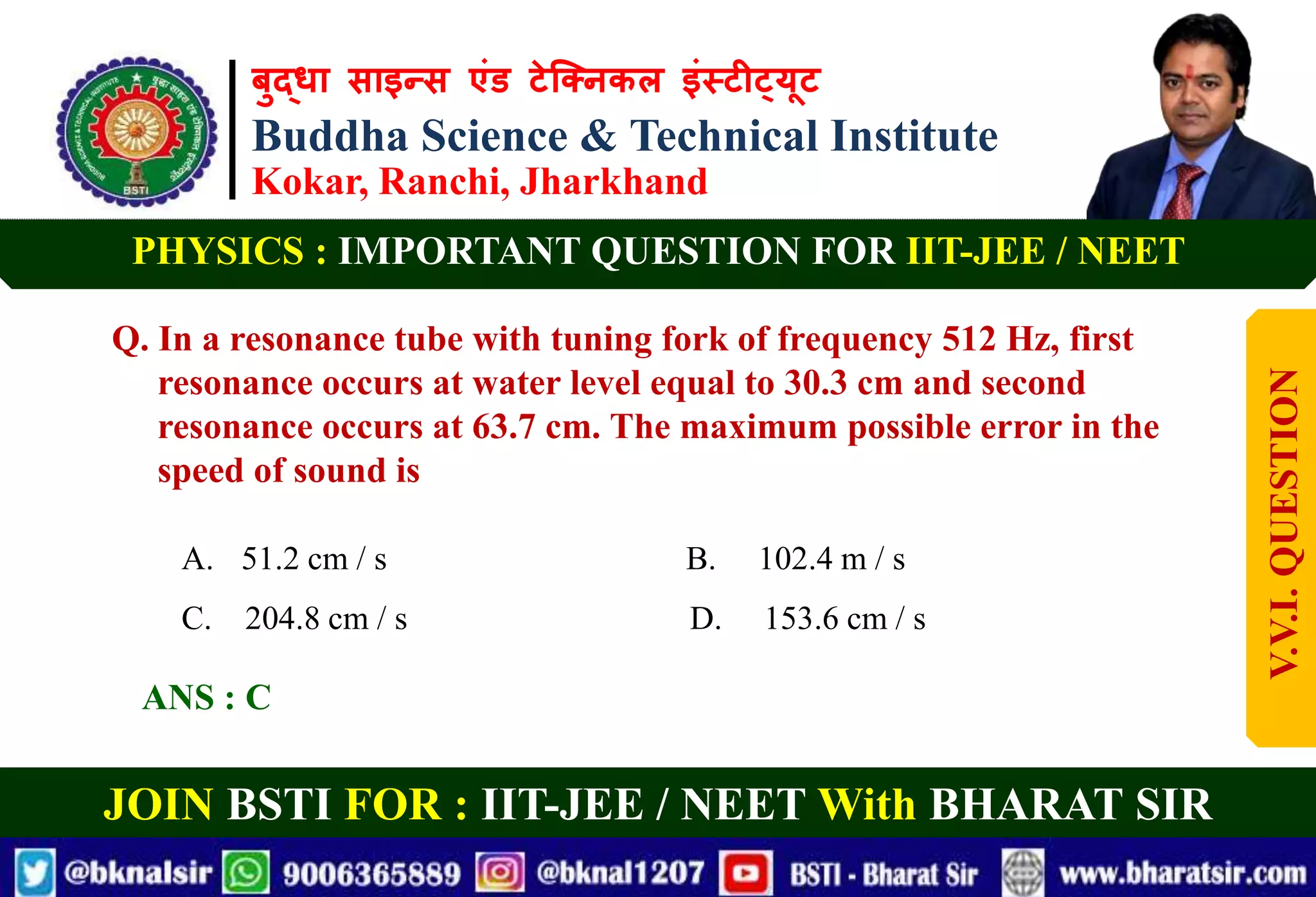 This document contains 20 physics questions and their answers related to waves, sound, and optics. It is from the Buddha Science & Technical Institute in Ranchi, Jharkhand, India and encourages joining their courses to prepare for IIT-JEE and NEET exams. The questions cover topics like resonance, wave properties, sound waves, Doppler effect, redshift, and more. For each question, the correct multiple choice answer is provided along with an explanation of the concept.