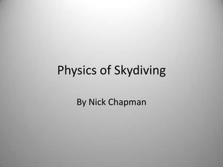 Skydiving involves jumping from an airplane and falling through the air until deploying a parachute. Skydivers accelerate due to gravity until air resistance equals the downward force, reaching terminal velocity. Felix Baumgartner set records by skydiving from 39,000 meters, falling at speeds over 700 mph before his parachute slowed his descent. Newton's laws of motion describe the forces acting on skydivers as they fall and deploy parachutes to land safely.