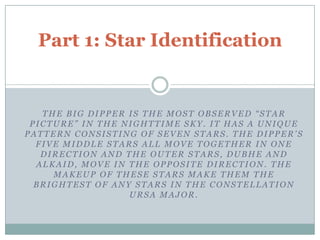 1) The stars of the Big Dipper constellation and their properties such as temperature, distance, and luminosity.