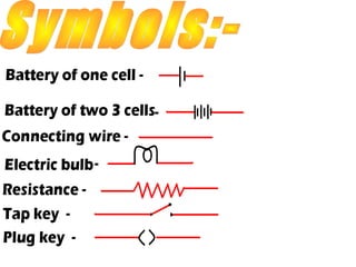 An electric circuit is a closed loop that allows electric current to flow from a power source, such as a battery, through conducting materials, like wires, to an electrical device and back to the power source. The key components of a circuit are a power source, conducting wires or strips, a device to use the current like a light bulb, and a switch to open or close the circuit. When a switch in a flashlight circuit is closed, current can flow from the battery through the conducting strips to the light bulb, causing it to glow, before returning to complete the circuit.