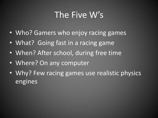 This document outlines a proposal for a new physics-based racing game called XTREEM PHIS X RACER. The game would use realistic physics and interesting maps that change orientation. It would target teenage and young adult gamers interested in fast-paced games. The developers provide details on competitors, prototypes, business plans, and marketing strategies to make the game free-to-play supported by ads. They believe the game could become popular like Flappy Bird through competitive online racing and leaderboards.